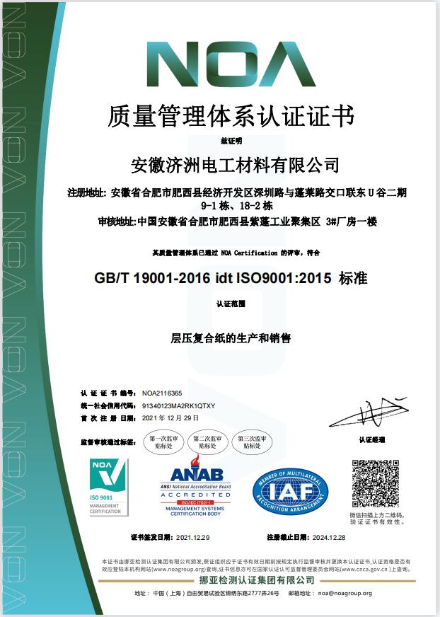 濟(jì)洲控股旗下安徽濟(jì)洲電工材料有限公司順利通過ISO9001質(zhì)量管理體系認(rèn)證,質(zhì)量是企業(yè)發(fā)展的第一生產(chǎn)力,濟(jì)洲人始終秉持質(zhì)量第一、客戶第一的宗旨,致力于給客戶提供高品質(zhì)絕緣材料。